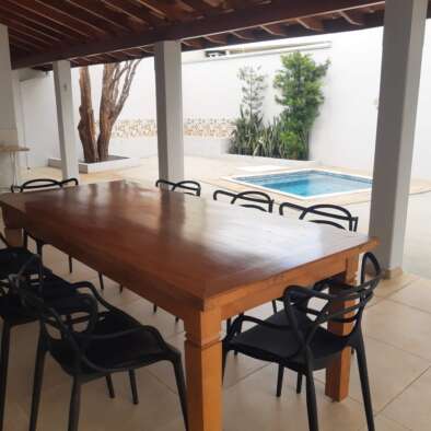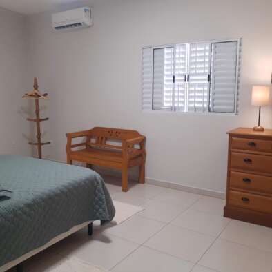 Casa para até 6 pessoas, com 3 quartos, sendo uma suíte com ar-condicionado. Ventilador ou ar-condicionado. Smart TV 42” e wi-fi. Cozinha completa com todos os utensílios e eletrodomésticos. Área externa com churrasqueira equipada, mesa para 8 pessoas, banheiro e hidromassagem climatizada (2,5x2,5m).